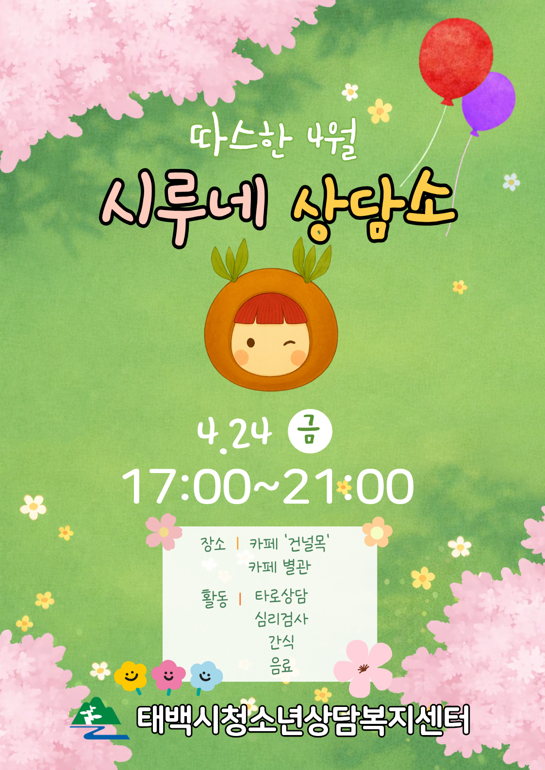 태백시청소년상담복지센터의 이야기 + 2026년 4월 24일 금요일 오후 5시 부터 오후 9시 까지 카페'건널목' 별관에서 시루네상담소를 운영합니다.태백시 청소년 여러분! 많이많이 놀러 오세요! 2026년 4월 시루네상담소 가정의달 푸르른 5월 태백시청소년상담복지센터 휴관일 안내입니다.가족 및 소중한 사람들과 즐겁고 행복한 시간 되시길 바랍니다. 태백시청소년상담복지센터 5월 휴관 안내 학교 밖 청소년 힐링프로그램 모집 학교 밖 청소년 힐링프로그램 모집 2026년 강원특별자치도 꿈드림 체육대회 및 청소년축제 참가자 모집 2026년 제1회 검정고시 응시 이동지원 안내 2026년 제1회 검정고시 응시 이동지원 안내