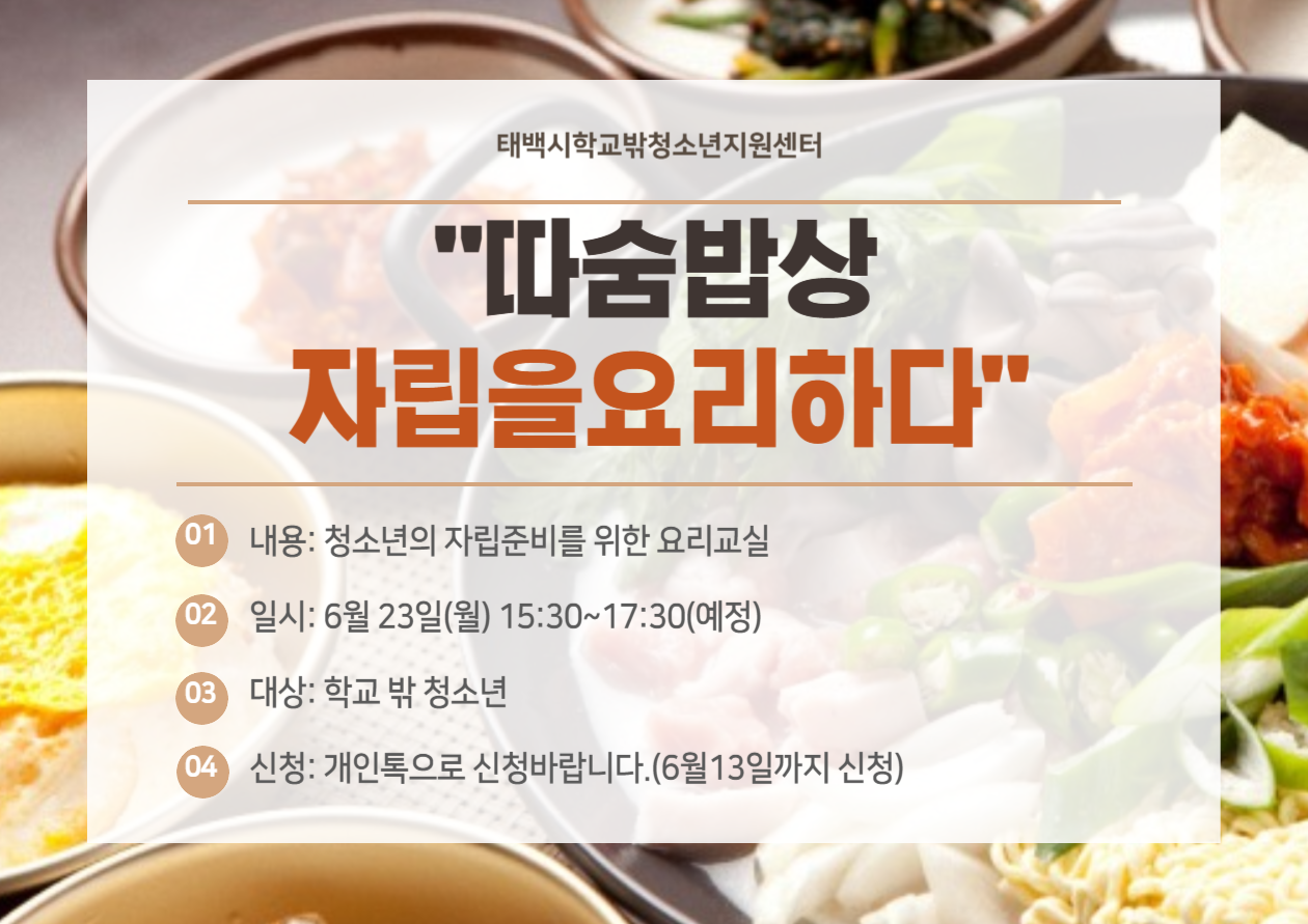 학교 밖 청소년의 자립준비를 위한 요리교실이 진행 될 예정입니다.
