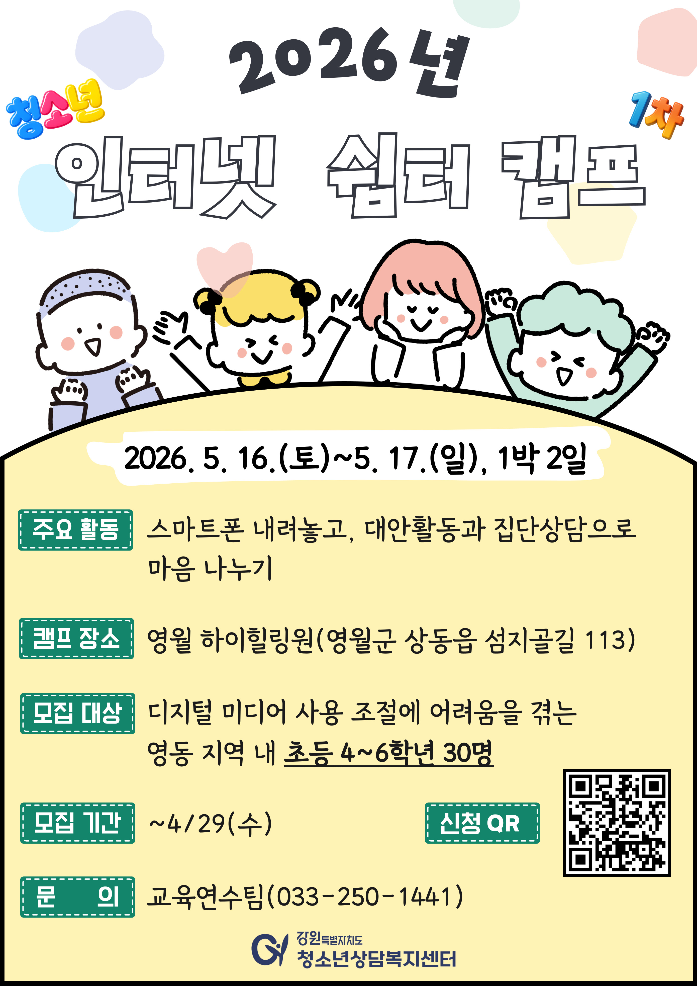 태백시청소년상담복지센터의 이야기 + - 학교밖청소년지원센터 문화체험 프로그램 '명동난타공연 관람' 청소년 모집 - 대상: 태백시학교밖청소년지원센터 등록 청소년 - 문의: 033)582-1389 2026년 학교밖청소년지원센터 문화체험 모집 강원특별자치도 청소년상담복지센터에서 강원도내 미디어 과다사용 초등 4학년 ~ 6학년 청소년을 대상으로 인터넷 쉼터 캠프를 진행합니다. 강원특별자치도 청소년상담복지센터 2026년 인터넷 쉼터 캠프 2026년 4월 24일 금요일 오후 5시 부터 오후 9시 까지 카페'건널목' 별관에서 시루네상담소를 운영합니다.태백시 청소년 여러분! 많이많이 놀러 오세요! 2026년 4월 시루네상담소 가정의달 푸르른 5월 태백시청소년상담복지센터 휴관일 안내입니다.가족 및 소중한 사람들과 즐겁고 행복한 시간 되시길 바랍니다. 태백시청소년상담복지센터 5월 휴관 안내 학교 밖 청소년 힐링프로그램 모집 학교 밖 청소년 힐링프로그램 모집